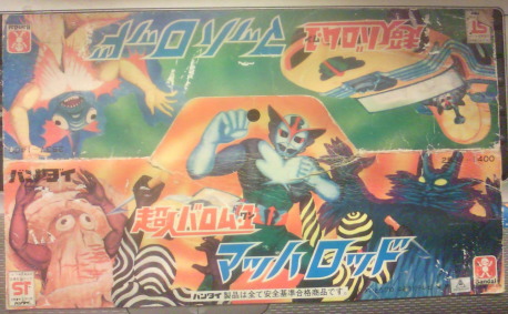 | これは、ヘッダー。 横幅をとるマッハロッドが入っていた袋のヘッダーだけあって、 ソフビ人形のヘッダーよりもワイドです。 主人公のバロム・1や商品のマッハロッドだけでなく、 ドルゲに魔人にアントマンまで描かれており、 番組の作品世界が一目で理解出来ますね。 第1話登場の魔人であるオコゼルゲが描かれてるのは一般的ですが、 もう1体描かれているのがキノコルゲ、ってところに妙味を感じます(笑)。 |