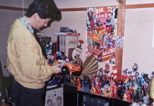 我が家へ帰ってきて、 購入したてのマッハロッドを愛でる僕・・・、の図。 37年前の、“至福の時” です。 いい写真でしょ?(笑) 第253回「例外・番外・想定外」の中でも述べましたが、 当時はコレクションケースなど無く、 ステレオの上に、こうやってソフビ人形たちを飾ってました。 コレクションを始めて半年の時点で何を所有していたか、を 自分でも確認しながら当時を懐かしめる、 そんな意味でも、やはり、いい写真です(笑)。 |