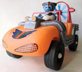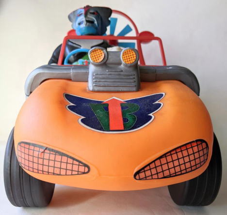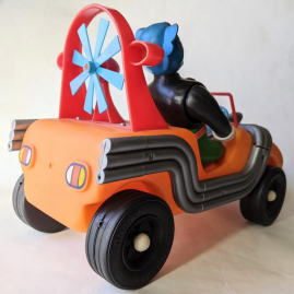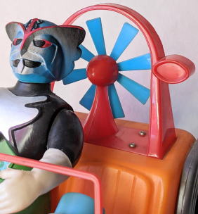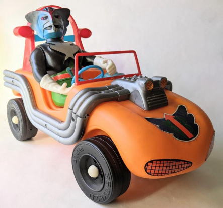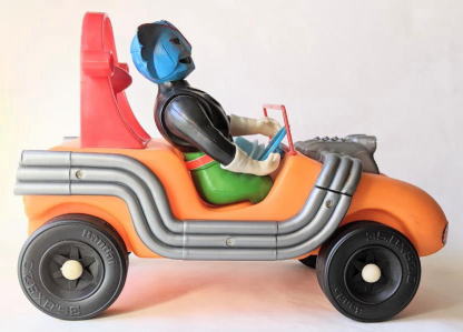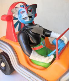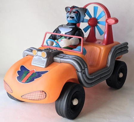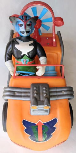 マッハロッド バンダイ製、全長約37センチ、全高約25センチ。 言わずと知れた、バロム・1の愛用車で、 『超人バロム・1』放映時(昭和47年)のポリエチレン製幼児向け玩具です。 ソフビコレクションを始めて半年くらいの頃・・・なので今から37年前の節季、 東京のアンティーク・トイ・ショップで見かけ、 その瞬間、 あの名曲主題歌『ぼくらのバロム・1』のイントロが頭の中にバーンと鳴り響き、 喜び勇んで購入したものなのですが、 その際、 ブルマァクのスタンダードサイズのキングギドラ人形が同じ値段で売っていて、 両方買うお金は持ち合わせておらず、どちらを買うか、迷ったンですよねぇ・・・。 |
