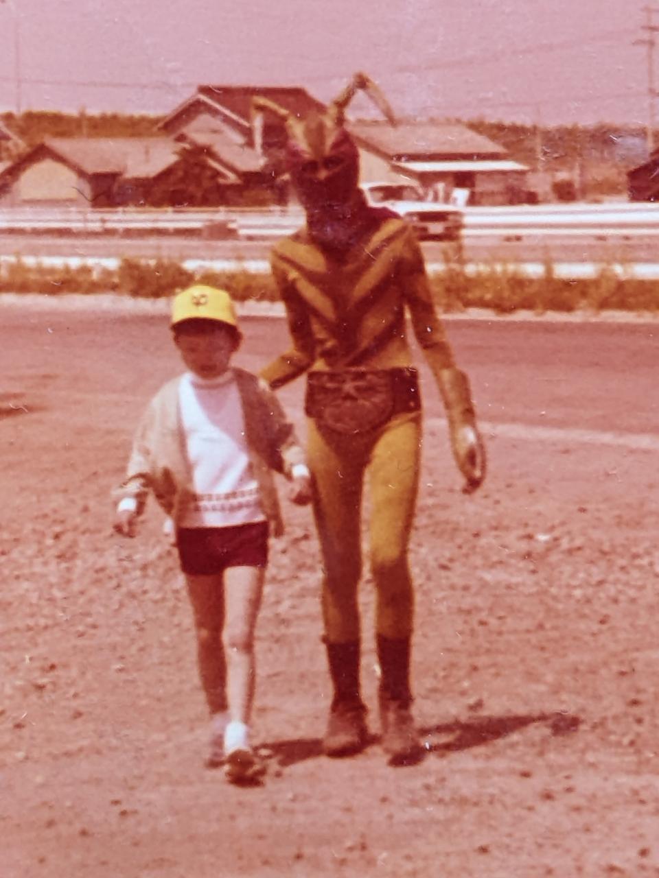 これは、第6回「仮面ライダーソフビ讃歌」の中でも紹介した写真ですが、 サニーワールド長島(当時、三重県の桑名市にあった熱帯動物園)で開催された、 仮面ライダーショーに連れていってもらった際のものです。 駐車場に着いたら、そこを、 なんと、かまきり男が歩いてたンですよねぇ・・・。フツーに。当たり前のように。 心臓が口から飛び出そうになりました。 思わず駈け寄ったら、 左手の大きなカマで頭を撫でてくれたのですが、 嬉しいのか恐いのかよくわかりませんでしたね、自分でも(笑)。 とにかく、めちゃくちゃ興奮した事は確かです。 なんたって、生まれて初めて、テレビスターを “生” で見たわけですから。 あの感動・感激は、忘れられません。 カマキリは “幸運をもたらす生き物” って、先ほど述べましたが、 カマキリの怪人・かまきり男は、僕にとって “幸運そのもの” だったわけです。 |