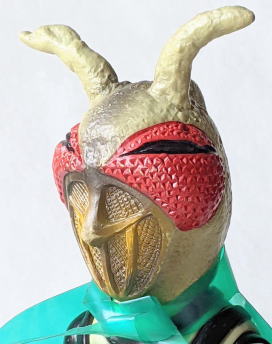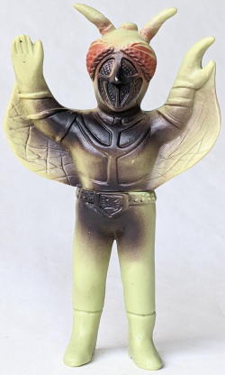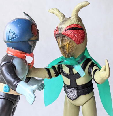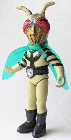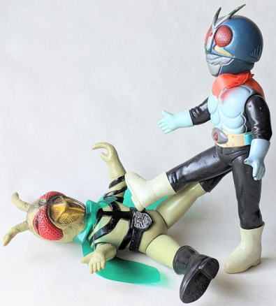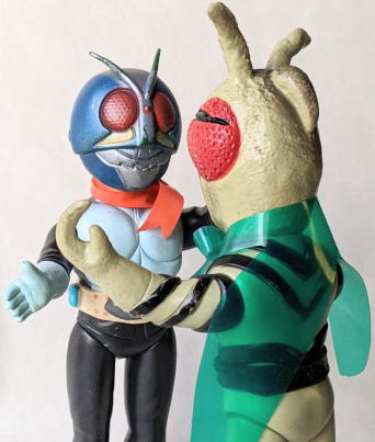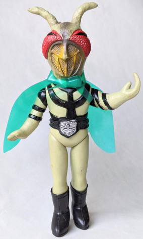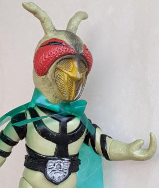 『仮面ライダー』第5話「怪人かまきり男」に登場した、かまきり男です。 本郷猛(すなわち仮面ライダー)の命を狙い、 更には、地下に配置した核爆弾を “かまきりの卵” なる起爆装置で作動させ、 人工地震を起こして都市を壊滅させようとする、 とんでもなく悪いヤツです。 とんでもなく悪いヤツですけど、 やっぱ、“昆虫の改造人間” という神秘的な不気味さに魅了され、 子供の頃(番組放映時の昭和46年~48年)、ソフビ人形を買ってもらって 夢中で遊び倒しましたし、 大人になってからも、下記のように、その当時のものを、 夢中で(笑)集めている次第です。 |