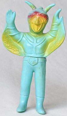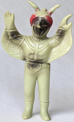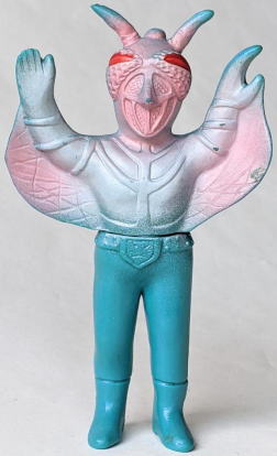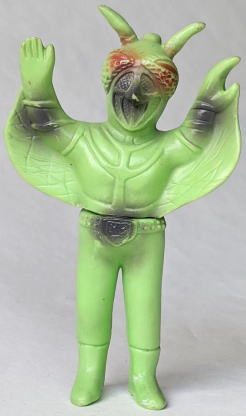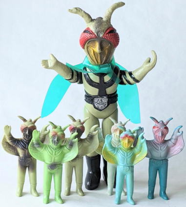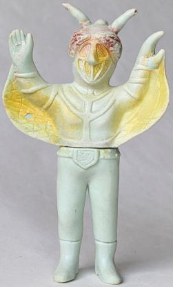 すべて、バンダイ製で全長約12センチ。 ミニサイズの人形は、 駄菓子屋でも売っていた廉価版玩具でありましたので、 親におねだりしなくても、 お菓子やジュースを買うのを2、3日我慢すれば、お小遣いで買えました。 なので、当時は、スタンダードサイズのかまきり男人形よりもとうに早く、 ミニサイズのかまきり男人形の方を手に入れていましたね。 ただ、近所の友達が持ってた同人形と、 色が微妙に違っていたのを憶えています。 おそらく、 上の段の向かって左端と真ン中の違いだったのだろうと思いますが、 まだ、ほかにも、いろいろなカラーバリエーションがあったンですね。 収集癖を刺激する、これぞ、アンティークソフビの妙味。 |